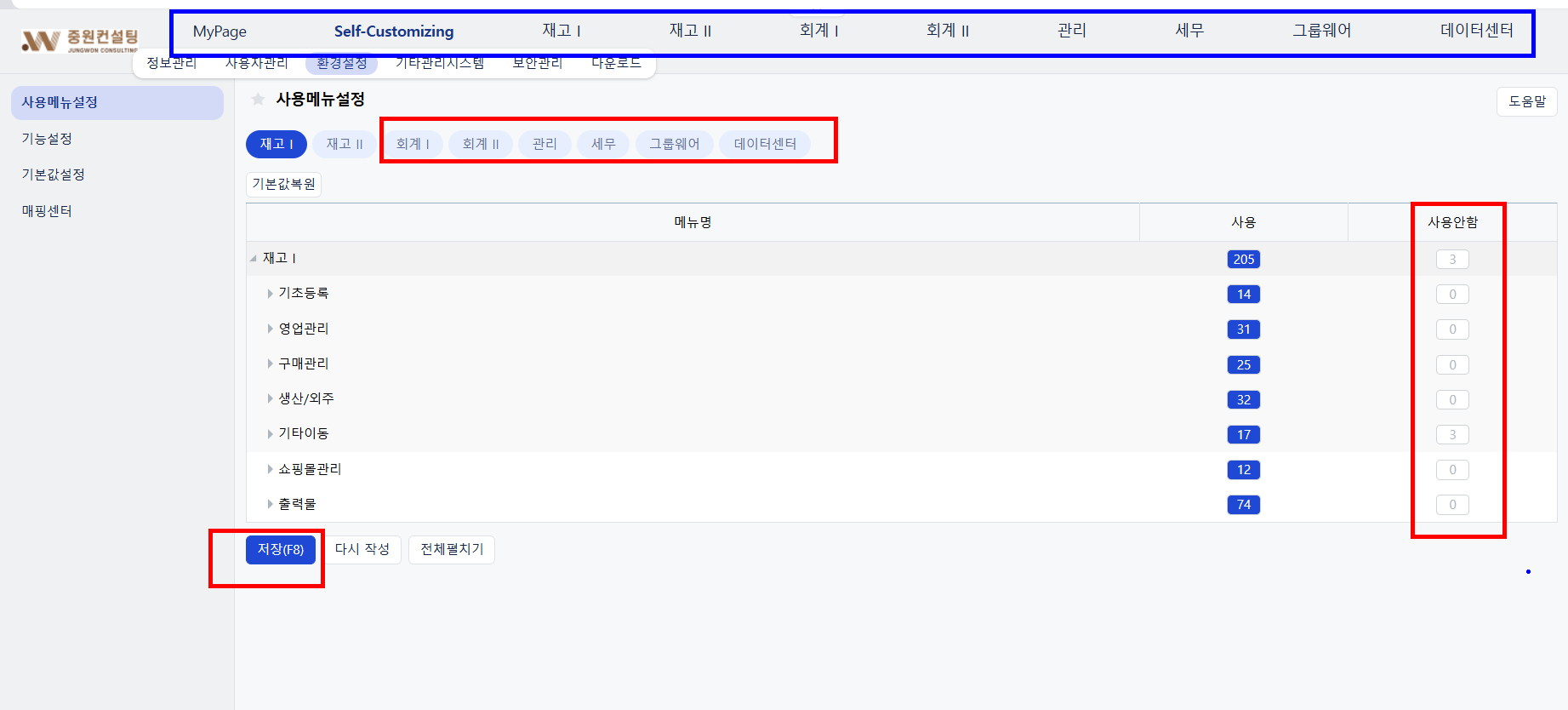 예를들어, 재고메뉴 사용만 필요한데, 다른 메뉴가 많아 불편한 경우라면 사용 메뉴 설정을 통하여 다른 메뉴들은 미사용 처리할 수 있습니다.