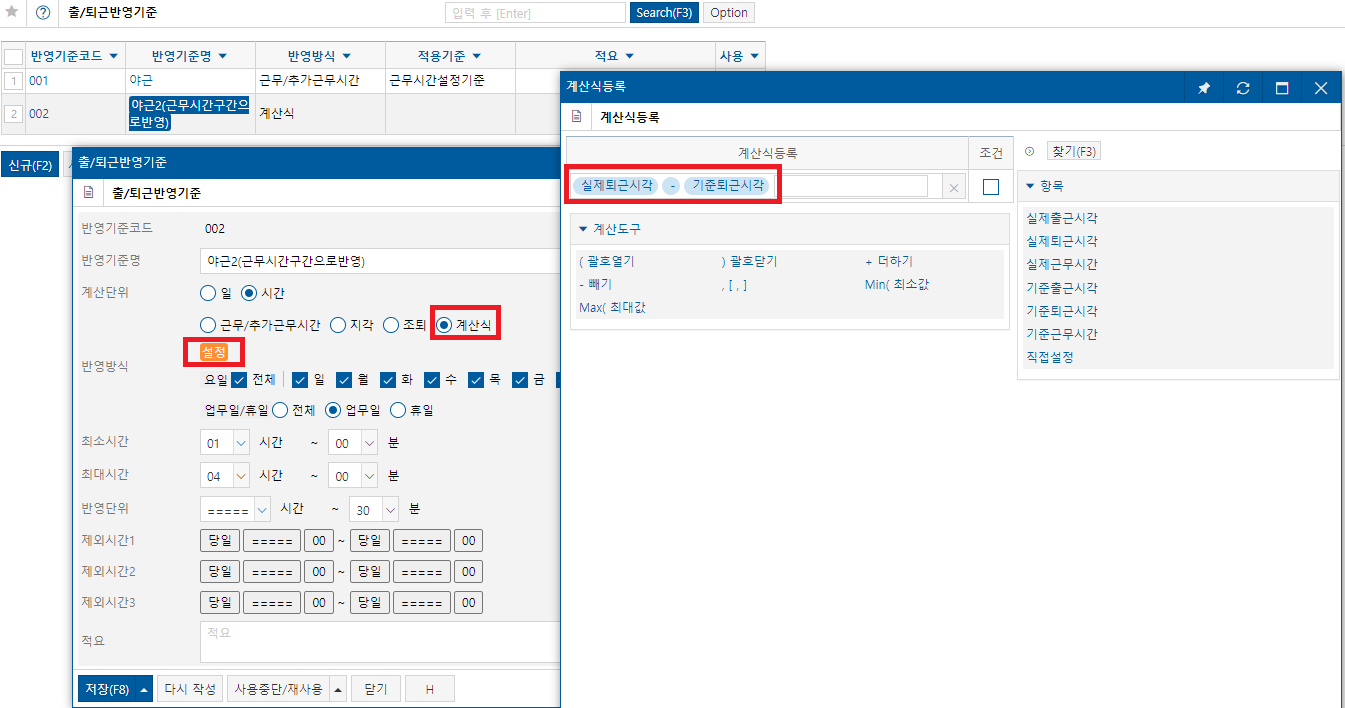 2. 기본 설정 후 근태 관리(관리 → 근태관리 → 근태항목등록, 출/퇴근반영기준, 출/퇴근기록부(사원)