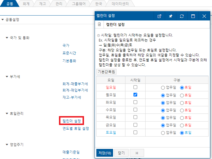 ① <Self-Customizing → 환경설정 → 기능설정 → [공통]탭 → 캘린더설정>