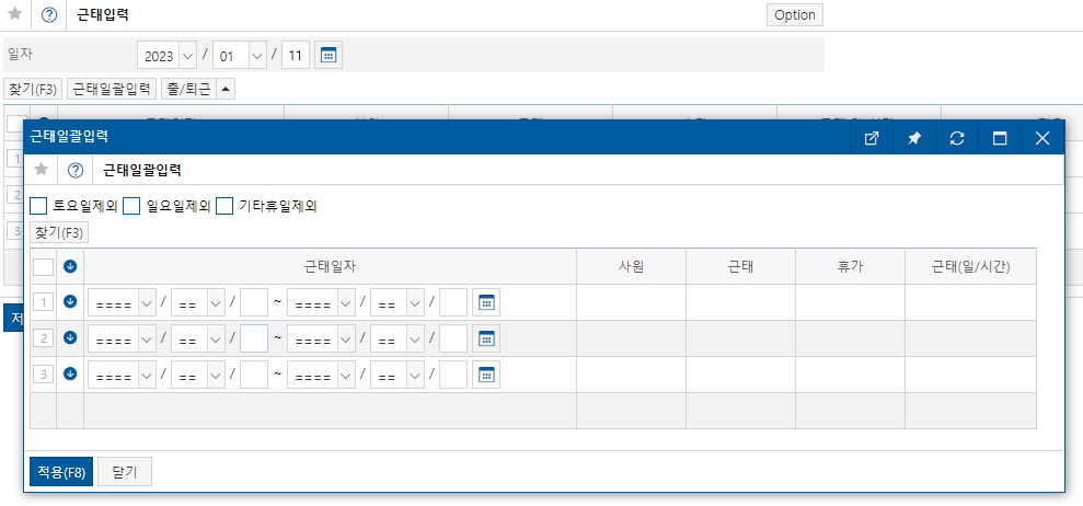 [근태일괄입력]에서의 토요일제외, 일요일제외, 기타휴일제외에 반영됩니다.