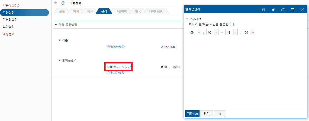 또한 Self-Customizing → 환경설정 → 기능설정 → [관리] 탭 → 우리회사근무시간, 근무시간설정을 세팅해줍니다.