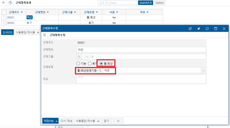 관리 → 근태관리 → 근태관리항목에서 '야근' 항목을 추가합니다. 이번 예시에서는 출/퇴근 반영을 하는 것으로 설정합니다. 출/퇴근반영기준에 미리 만든 '야근 코드' 를 반영합니다.