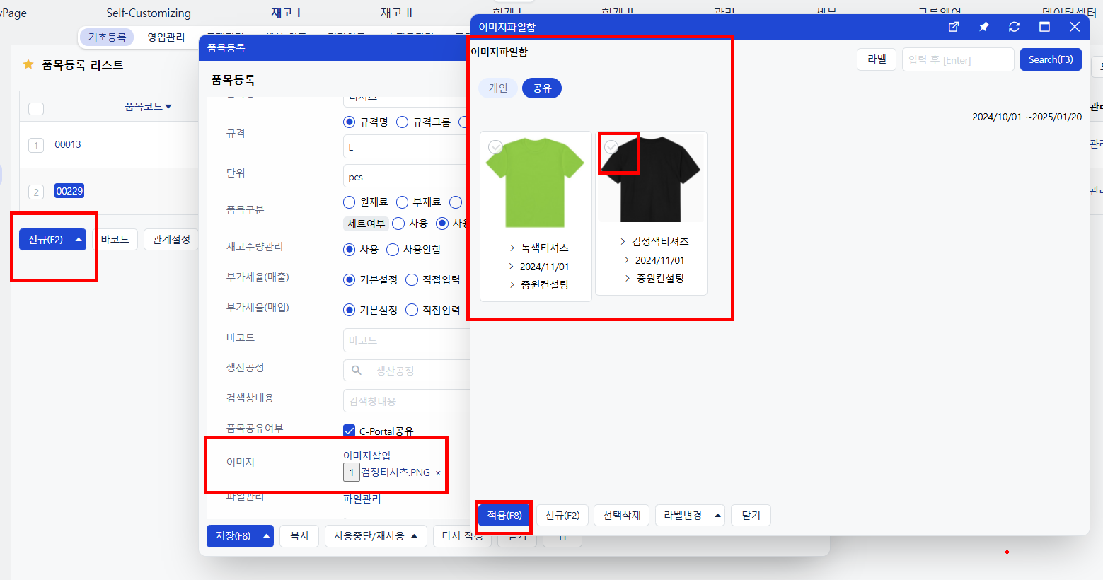 - 품목 등록 화면에서 이미지파일함의 사진을 불러와 등록 가능