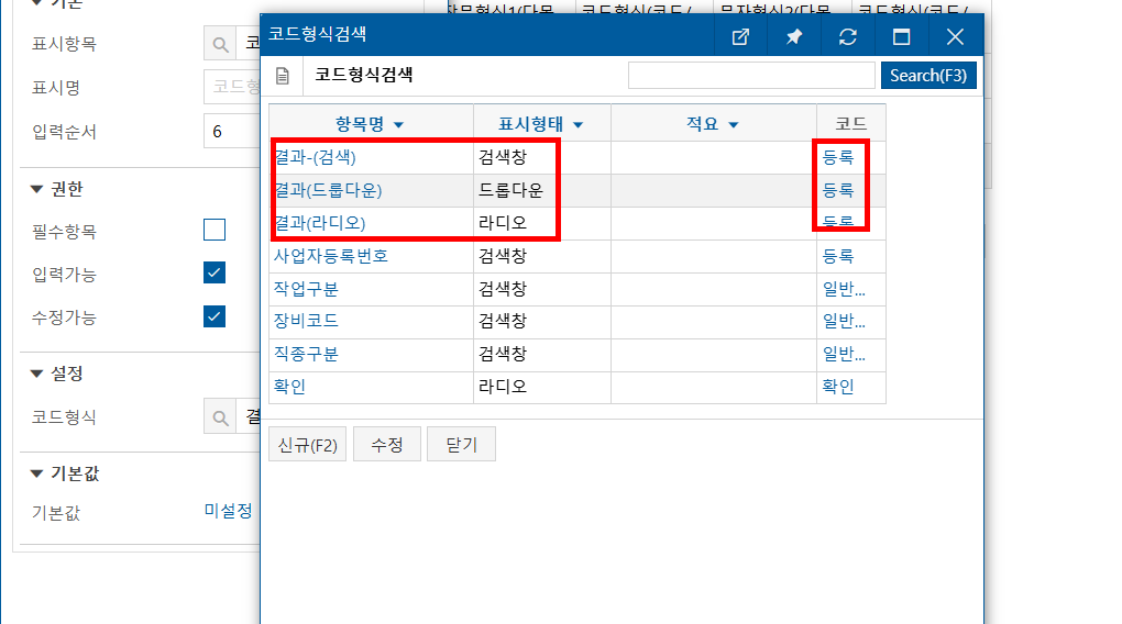 1. 신규 코드 등록: 항목명 및 값(예: 성공, 실패) 설정