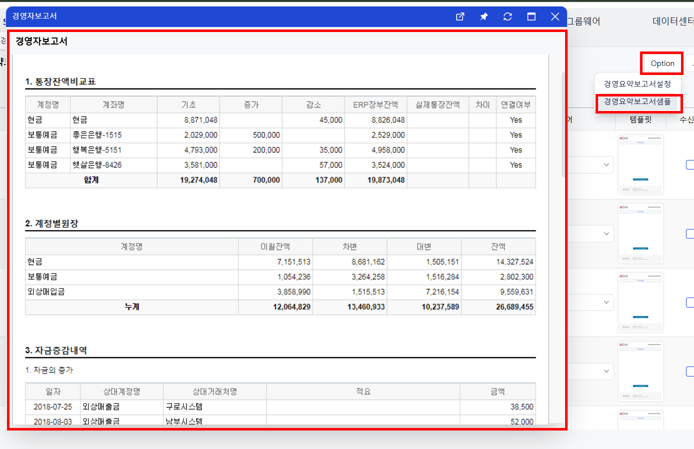 오른쪽 상단 Option - 경영요약보고서 설정 에서 보고서 종류와 시간 설정 가능