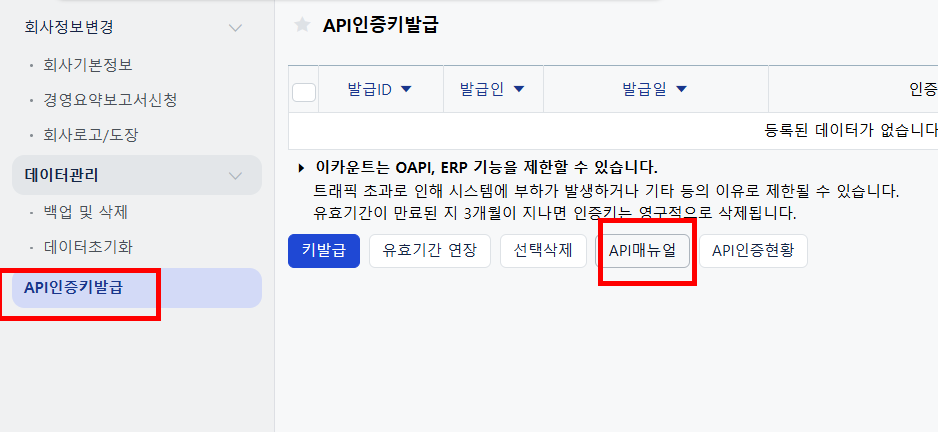 경로 : 정보관리 - API 인증키 발급