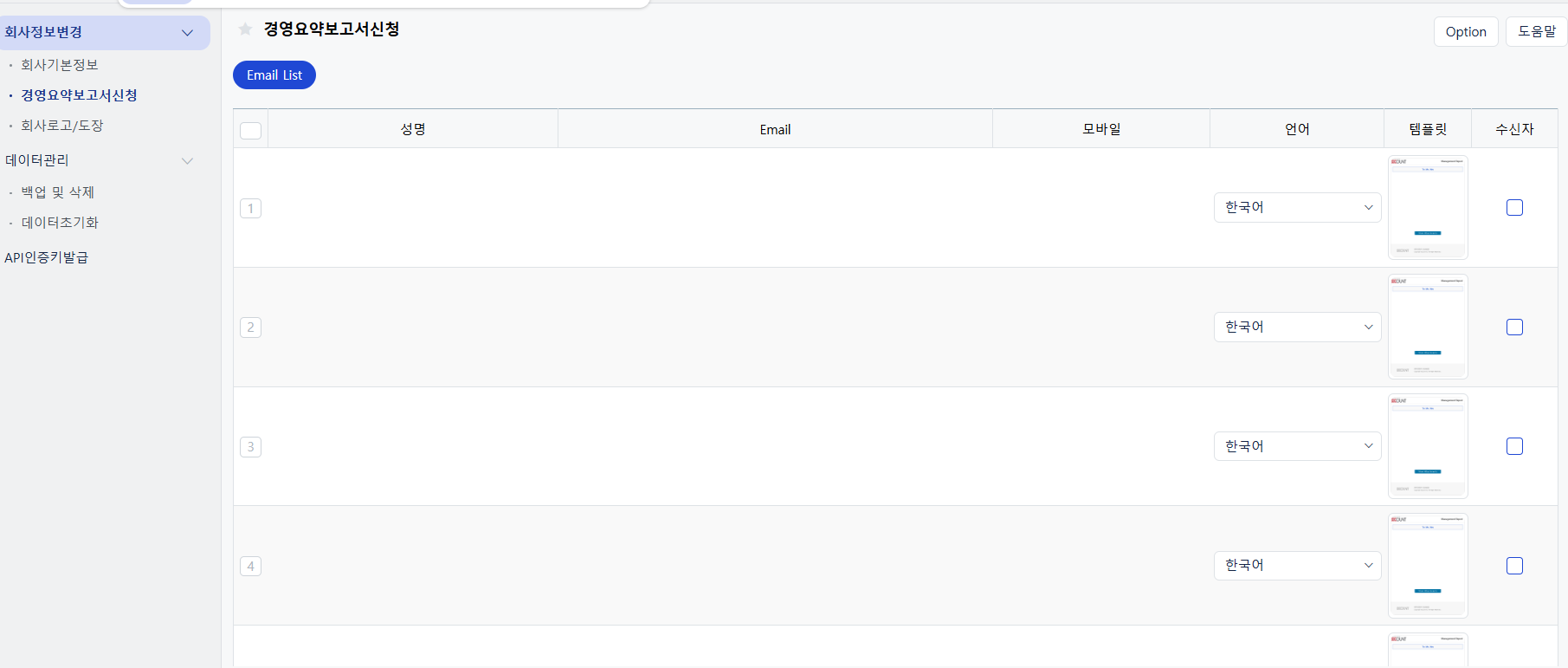 정보관리 - 경영요약보고서 신청→수신자 등록 후