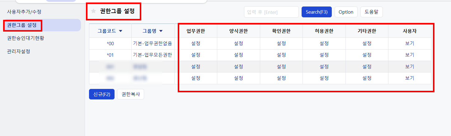 - 업무권한, 기타권한 항목 설정