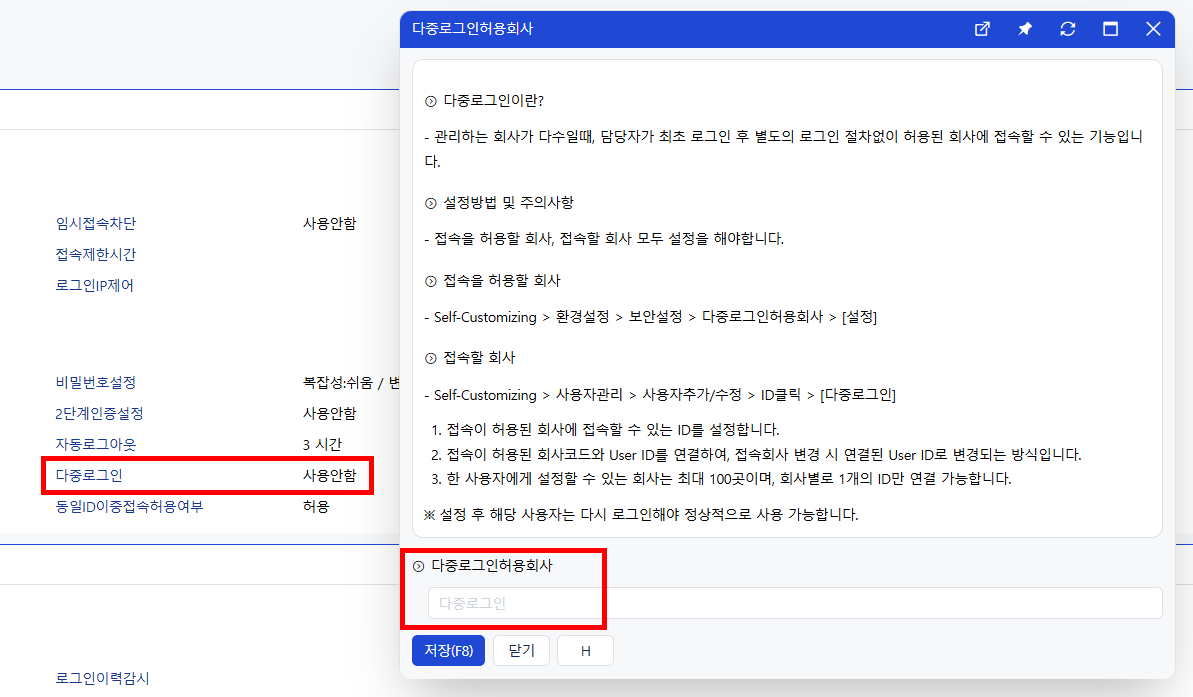 - 사유 입력 팝업 설정 가능(보안 로그 추적용)