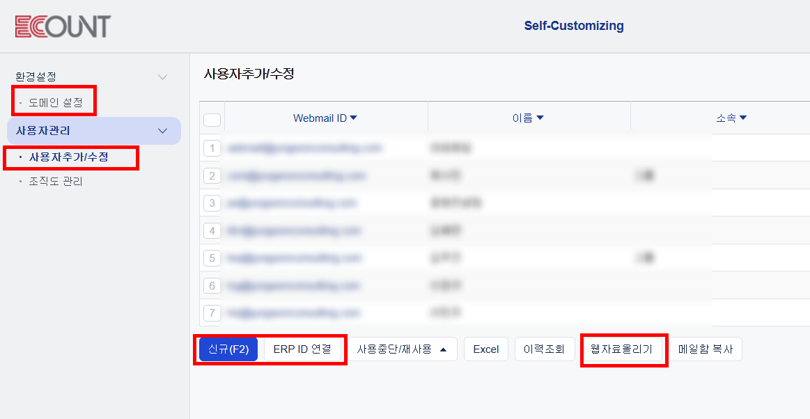 이카운트 Webmail 기능은 회사 전용 도메인을 연동하여 자체 사내 이메일 시스템을 구축할 수 있는 기능입니다.