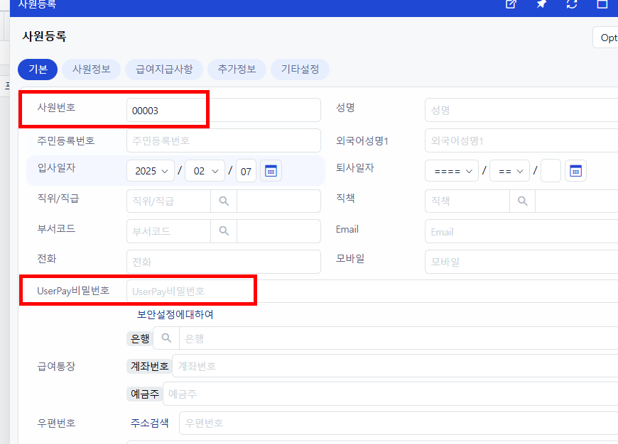 2. 사원 등록에서 UserPay용 ID/PW 설정