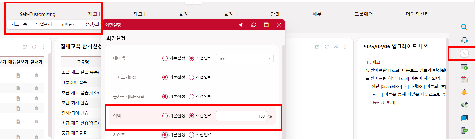 - 여백 : 상단/좌측 메뉴 간 여백 조정(150% ~ 50%)