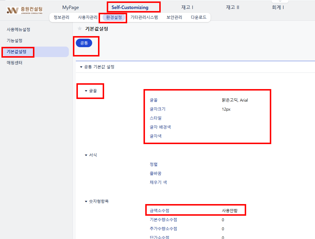 회사의 전체 메뉴 및 양식에 적용되는 기본값이므로 변경시 유의해야 합니다.