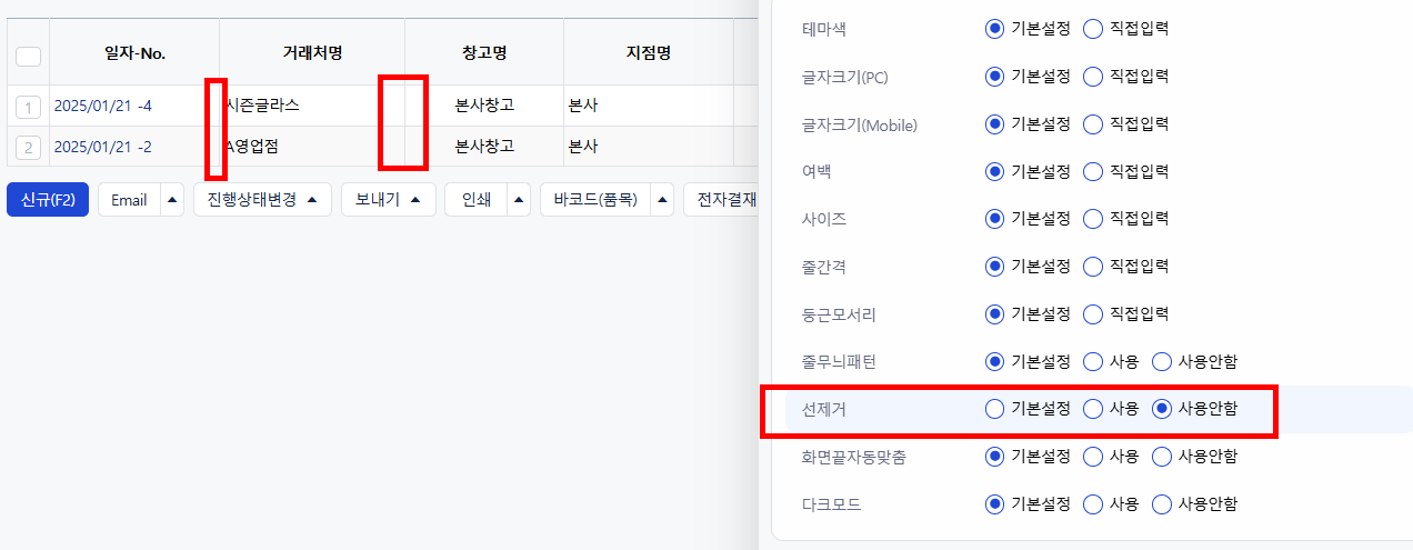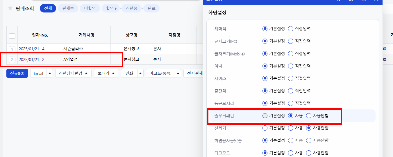 - 줄무늬 패턴 : 데이터 조회 시 격줄로 음영 표기 여부로 현황메뉴의 경우 양식 설정으로 설정 가능합니다.