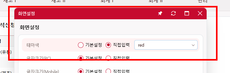 - 개인기능설정 > 화면설정 > 항목별 개념(*테마색의 차이를 보여드리기 위해 빨간색, 파란색으로 보여드립니다.)