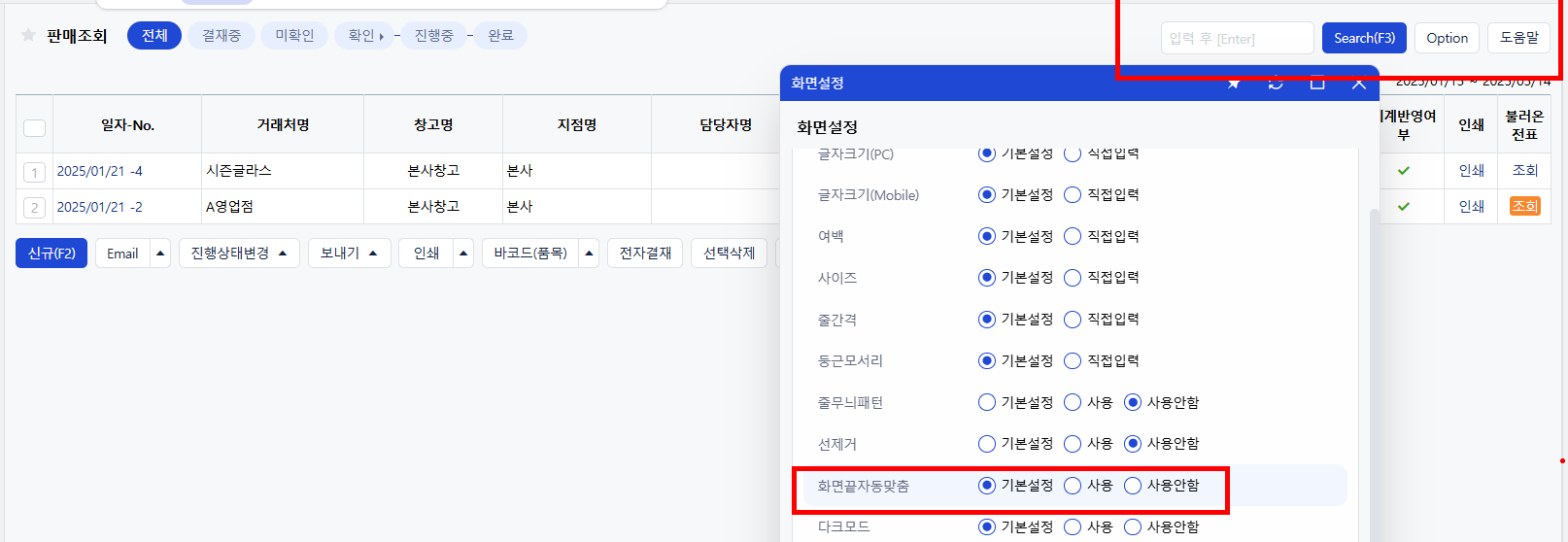 - 화면 끝 자동 맞춤 : 긴 화면에서도 조회 버튼을 상단에 유지