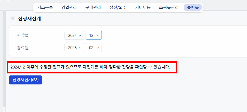 실수나 수정 이력이 누적된 경우엔 잔량재집계 기능을 활용하세요.