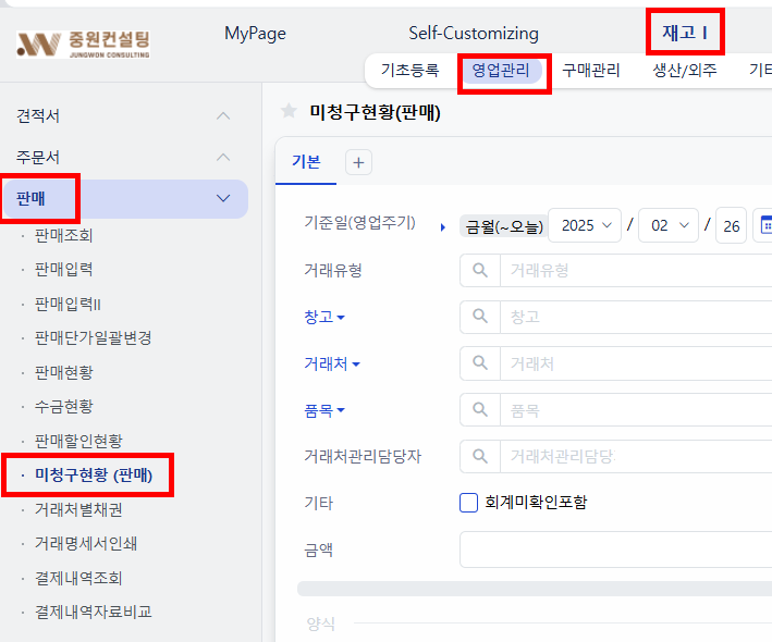 3. 필요 시 재고Ⅰ- 영업관리 - 판매 - 미청구현황(판매)에서도 잔여 미청구를 재확인