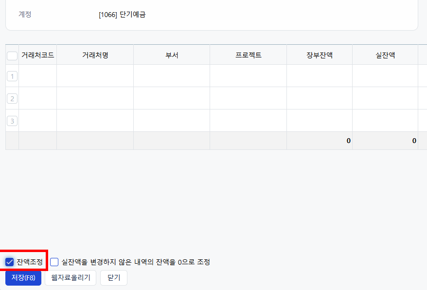 - 하단의 "실잔액을 변경하지 않은 내역의 잔액을 0으로 조정" 옵션 활용