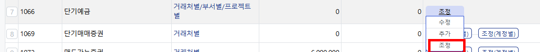 - 잔액조정 입력 후, 하단 '조정' 버튼에 마우스 오버 → '조정'클릭으로 장부 반영 완료