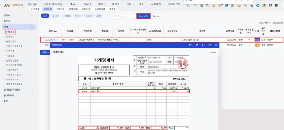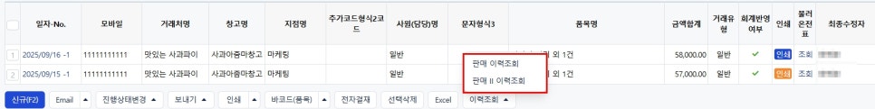- 판매 이력조회: 해당 전표의 작성/수정/삭제 이력 확인