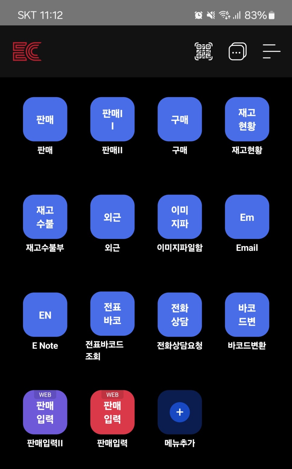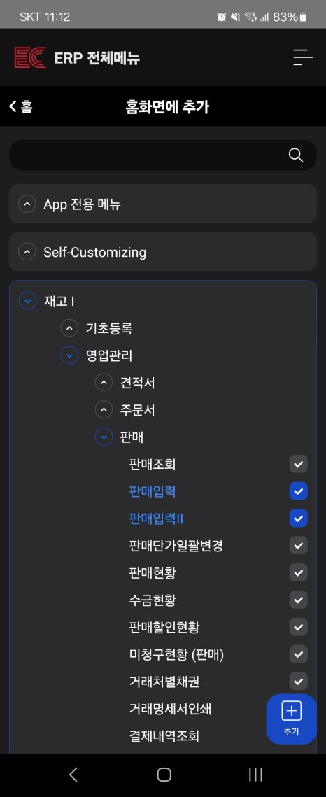 앱 로그인 → 메뉴추가 → 재고 → 영업관리 → 판매 → 판매입력 추가 - 모바일에서도 품목등록, 금액조정 모두 가능