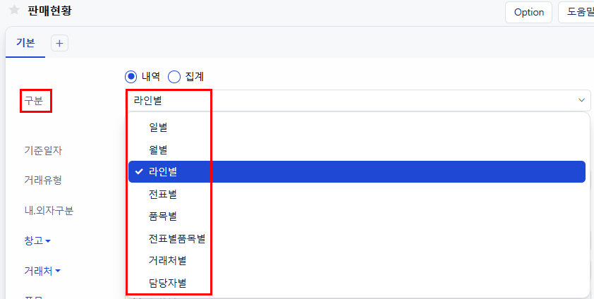 - 판매현황에서 [Search] 클릭 → ‘구분’에서 ‘라인별’을 포함하여 원하는 ‘구분’으로 조회 가능