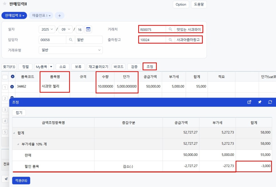 - 예시) 판매입력 II 입력화면 → 품목 등록, 금액조정, 실시간 할인 품목 적용 가능