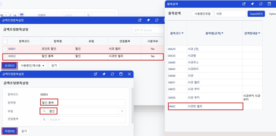 [신규] 클릭 > 항목명: 예)'할인 품목' > 유형:할인 > 연결품목: 할인 적용 품목 선택 > [저장]