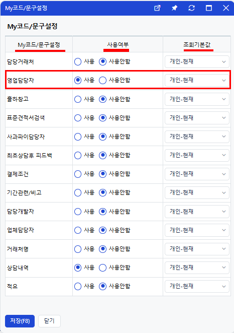 조회기본값: '개인-현재' (나만, 이 메뉴에서만 적용) 설정이 끝나면 [저장]을 누릅니다.
