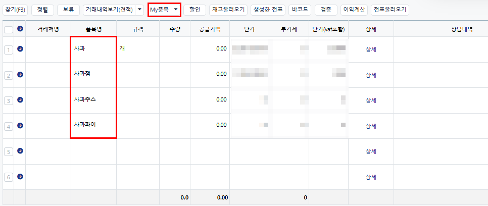 저장해 둔 품목들이 전표에 자동으로 입력되는 것을 확인할 수 있습니다.