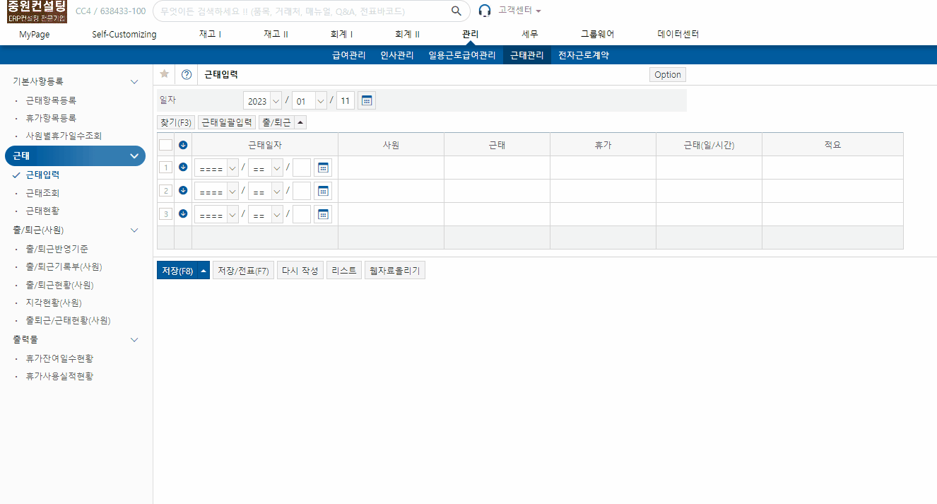 위 이미지에서 나온 근태 입력 시 연차코드를 불러오면 연차코드와 연결된 휴가코드를 불러오게 됩니다. 해당 화면에서 잔여 휴가 개수를 확인한 뒤 사용을 원하는 만큼 연차 개수를 입력합니다.