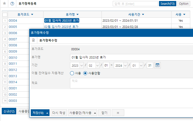 위와 같이 휴가 항목이 등록되어야 합니다. 회계기수는 보통 연초~연말 기준으로 하기 때문에 위와 같이 입력하였습니다.