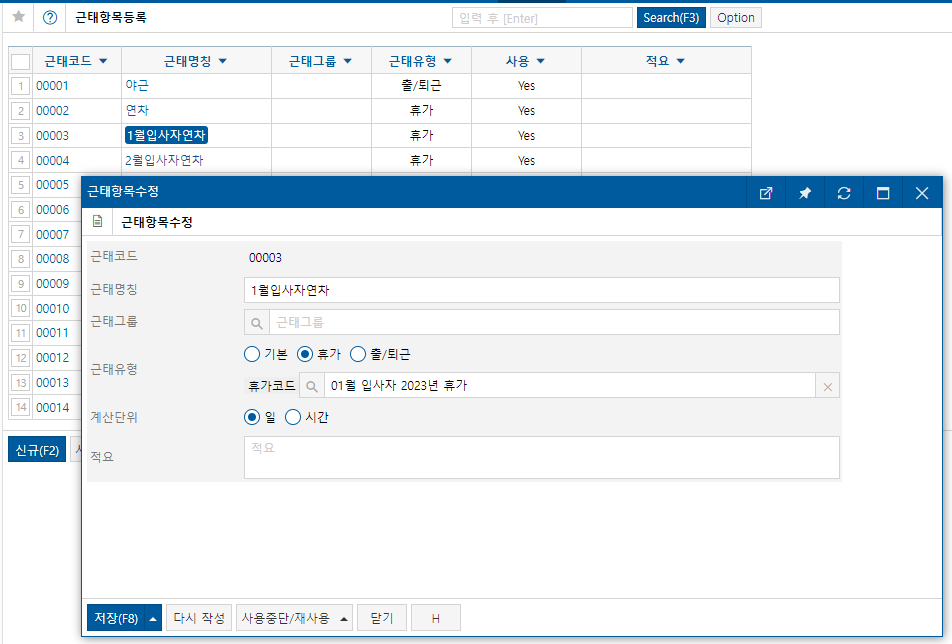 관리 -> 근태관리 -> 휴가항목등록 -> [신규] -> 원하는 근태코드&근태명칭 입력, 근태유형은 휴가로 선택합니다.