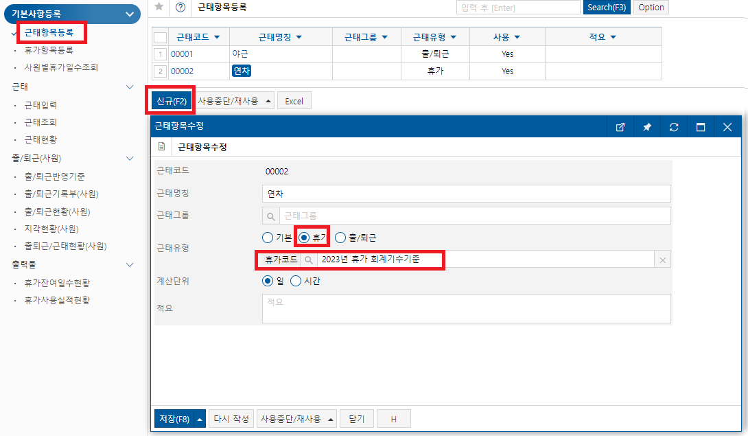 위 이미지의 근태유형 항목을 보면 휴가코드 부분에 '2023년 휴가 회계기수기준' 이라는 휴가 코드를 선택하였는데, 말 그대로 휴가 코드를 별도로 생성한 후에 선택해야 한다는 것을 뜻합니다.