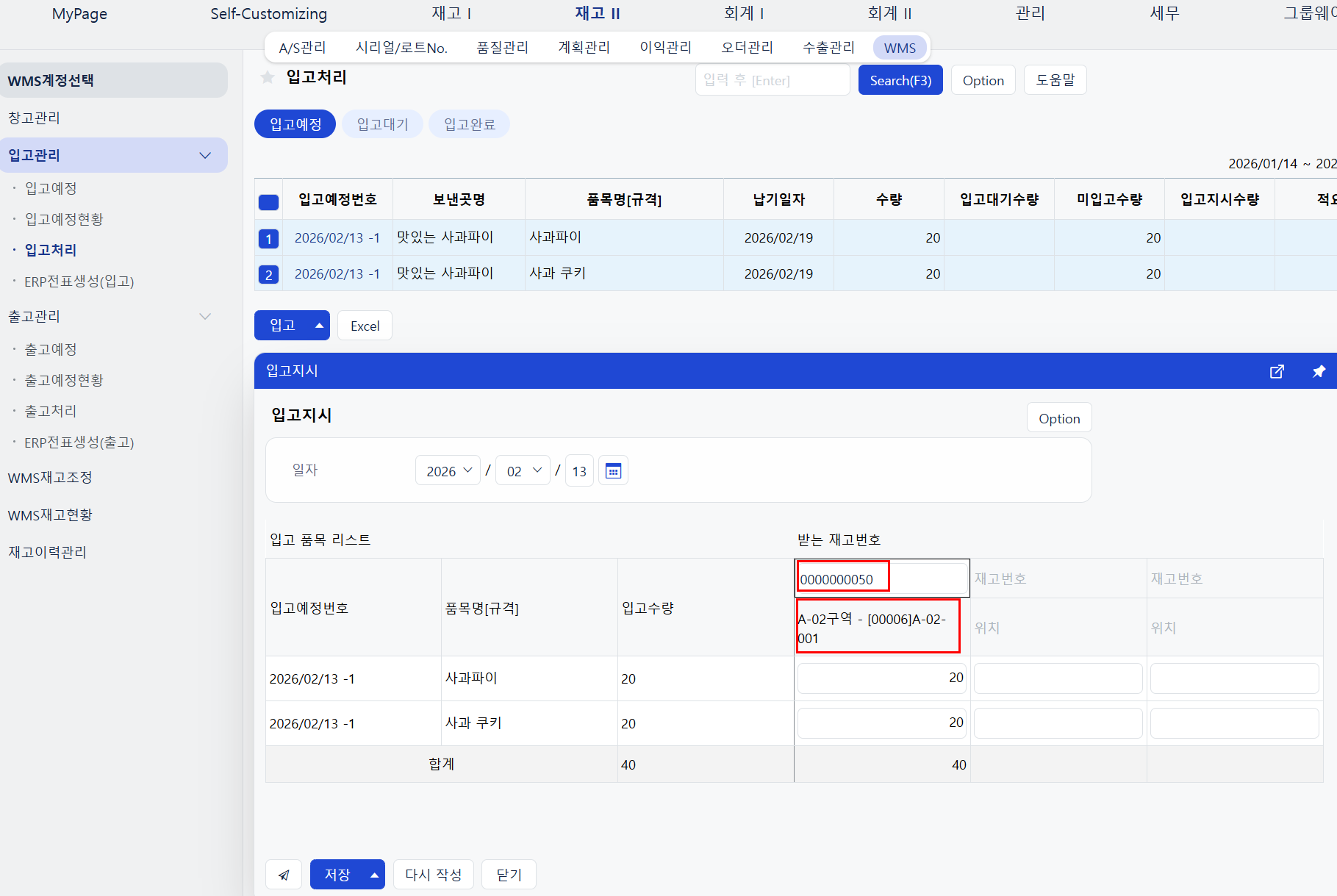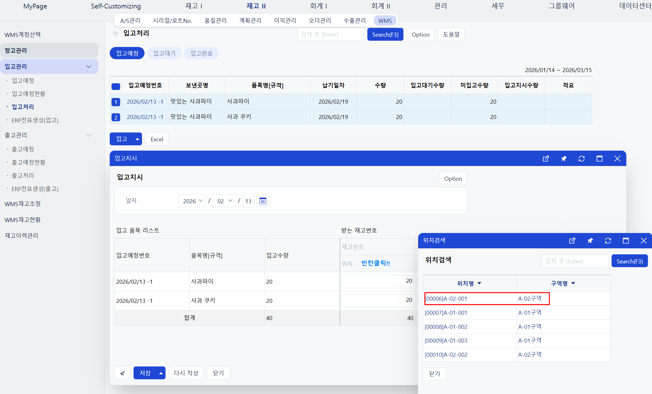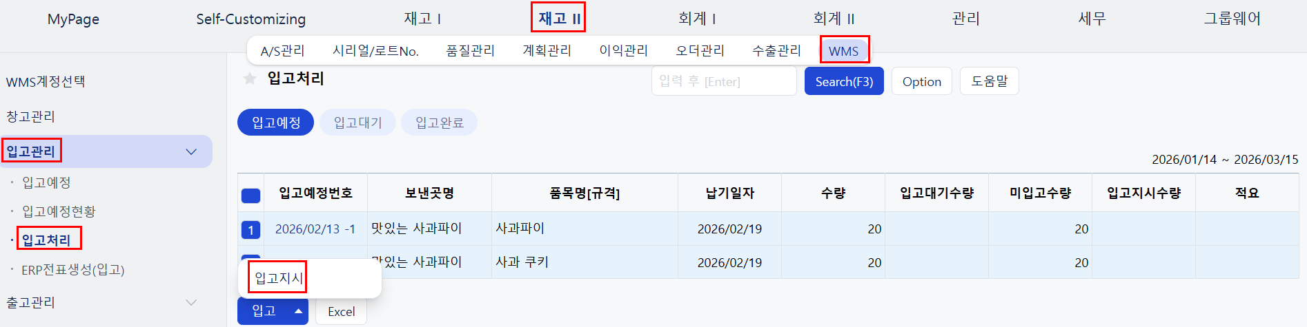 경로: 재고II > WMS > 입고관리 > 입고처리