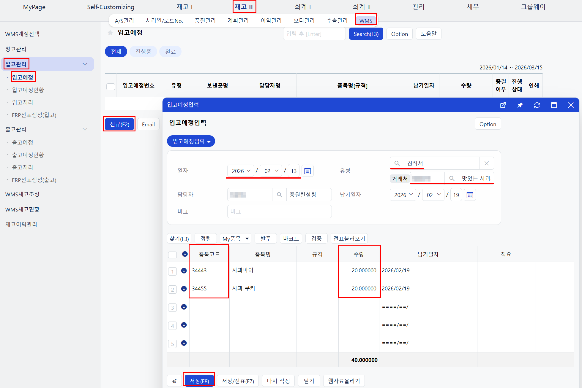 경로: 재고II > WMS > 입고관리 > 입고예정