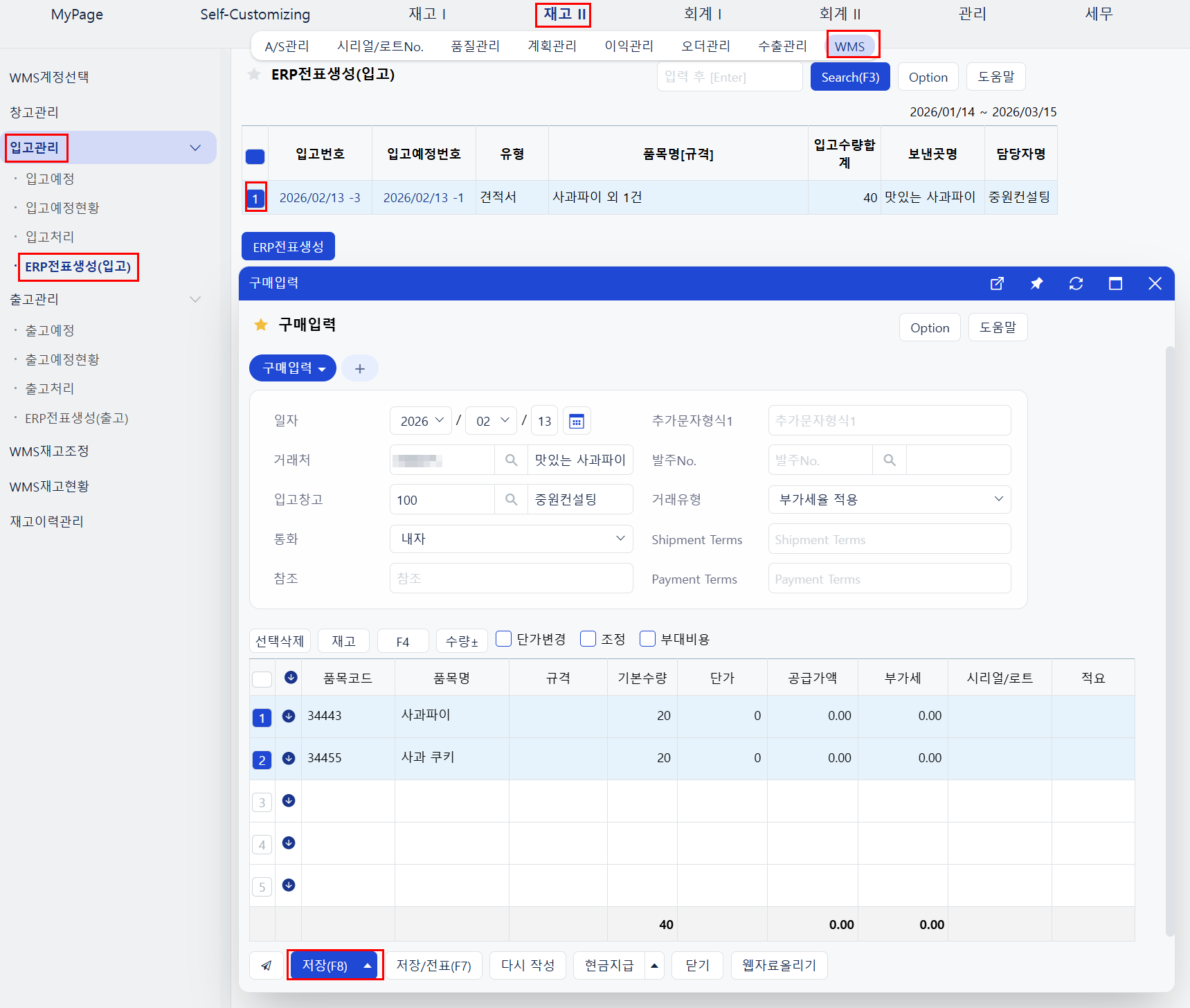 경로: 재고II > WMS > ERP 전표생성 > 입고
