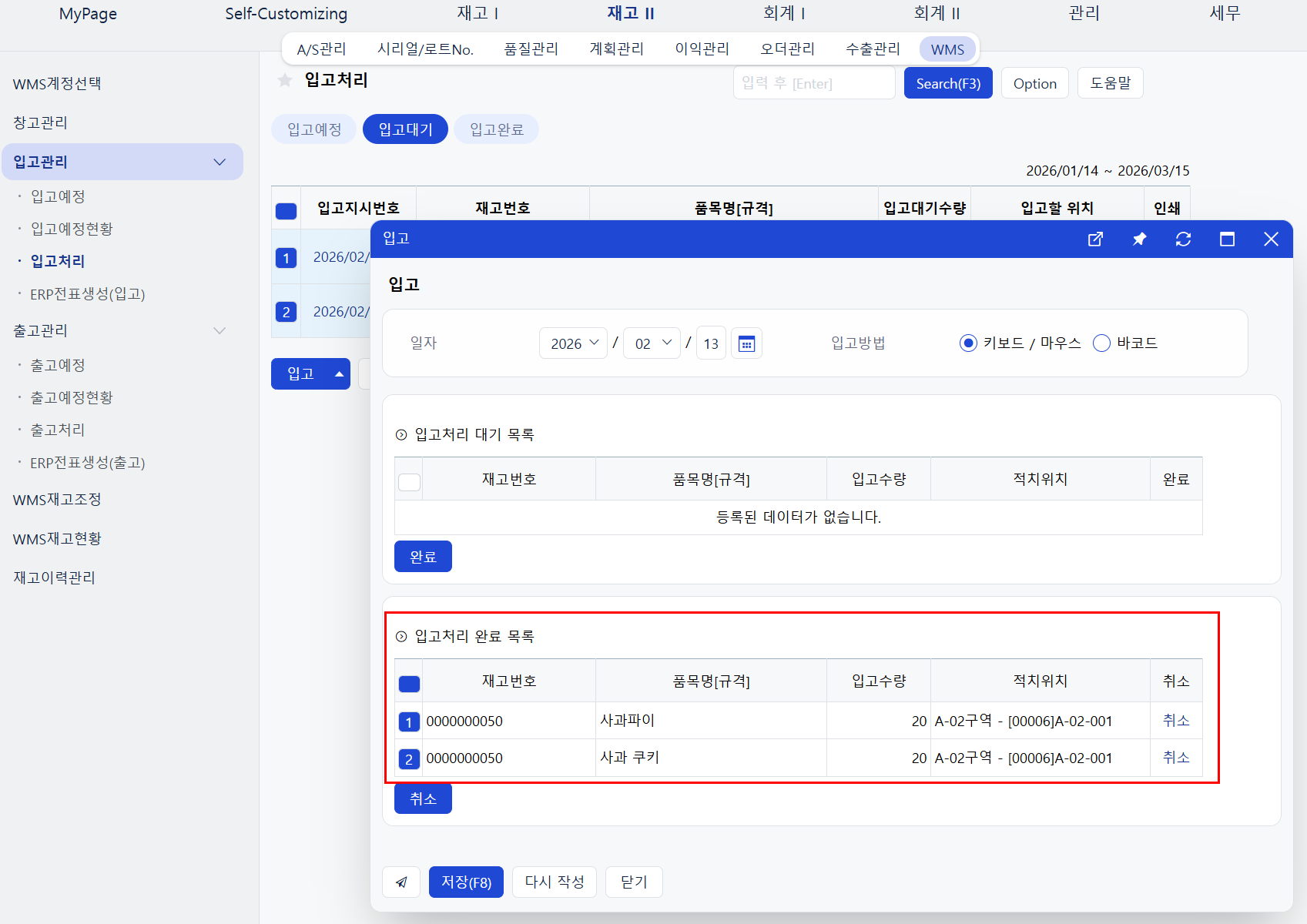 경로: 재고II > WMS > 입고관리 > 입고처리