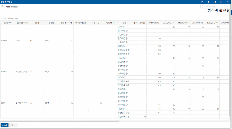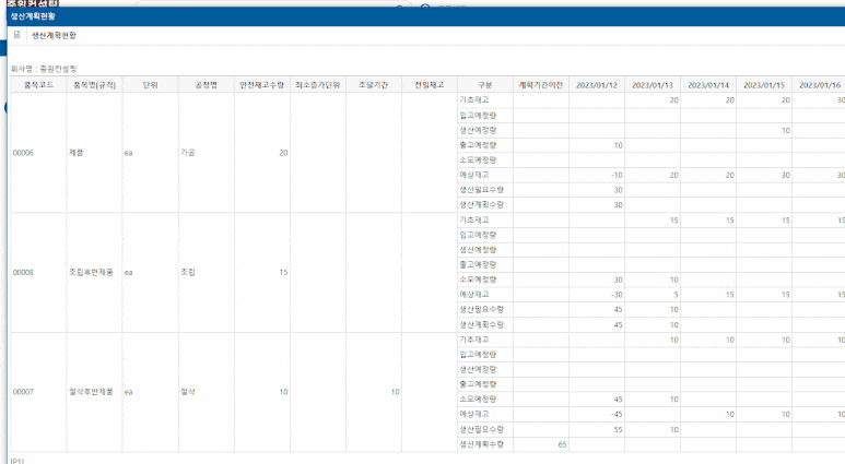 (예) 위 이미지처럼 오늘이 2023/01/11 이라면 생산계획생성 전 11일 기준으로 구매/생산 전표가 입력되어 있으면 안됩니다. 만약 입력이 되어있다면 다음날 오전에 생산계획을 잡는 것을 권장드립니다.)