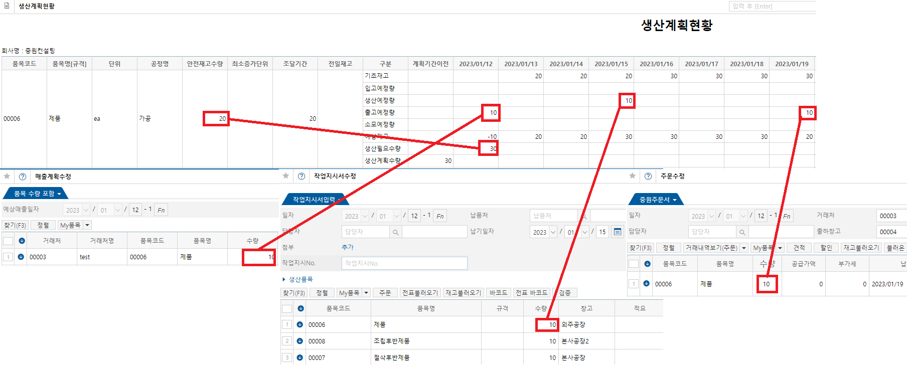 위 캡처 내역을 보면 안전재고수량, 매출계획입력, 미생산수량, 주문서입력(미판매)에서 입력한 수량이 반영된 것을 알 수 있습니다. (20+10-10+10= 총 생산계획수량 30) 미생산수량의 수량만큼 생산 후 동일 수량을 19일에 출고하게 되므로 총 생산계획 수량은 30으로 유지되는 것을 확인할 수 있습니다.
