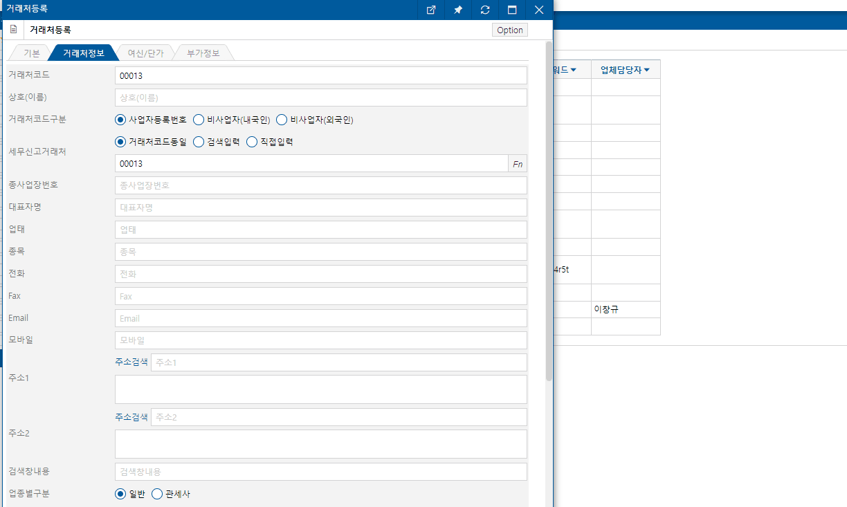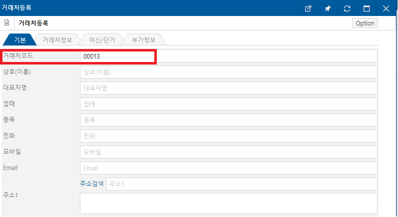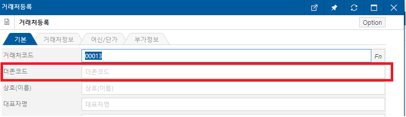 ☞ 사업자번호로 변경할 경우, 기존 솔루션에서 사용했던 코드를 추가 기입할 수 있는 필드를 추가합니다. 거래처등록 팝업창 우측 상단 "[Option] 클릭 → 입력화면설정"에서 추가하실 수 있습니다.