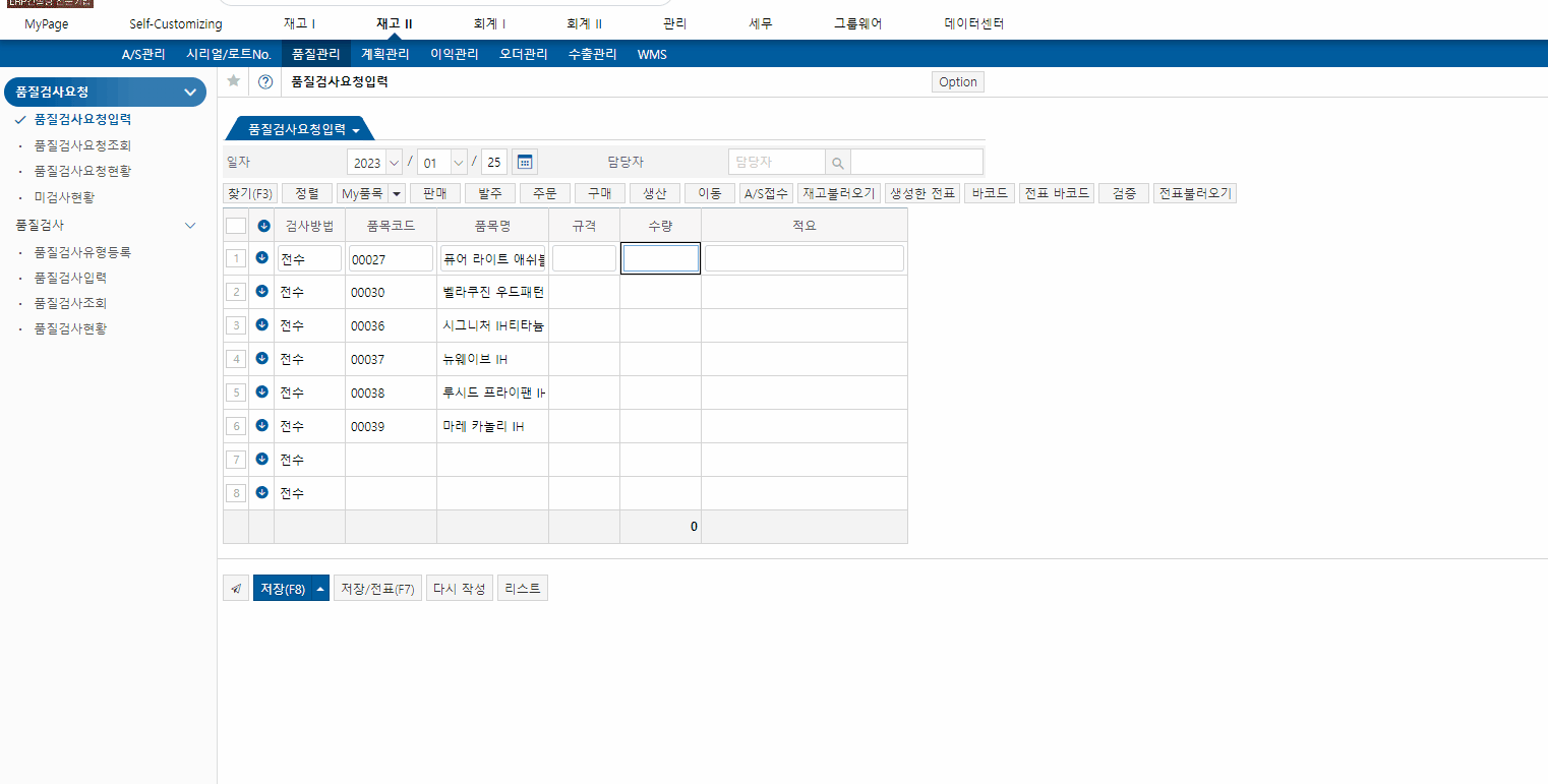 품질검사입력화면 검사 항목 클릭 시 해당 품목과 연결된 검사 항목별 입력을 진행합니다