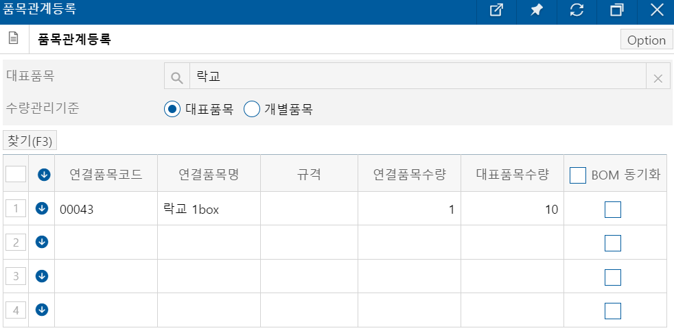 1. 관계설정의 3) 방식을 활용하면 되나, 하위 품목이 다양한 경우에는 세트 품목을 구성하셔야 합니다.