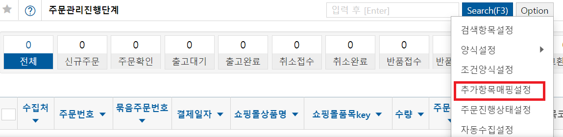 위와 같이 등록 후 주문관리진행단계 메뉴 우측상단 [option] > 추가항목매핑설정을 클릭합니다.
