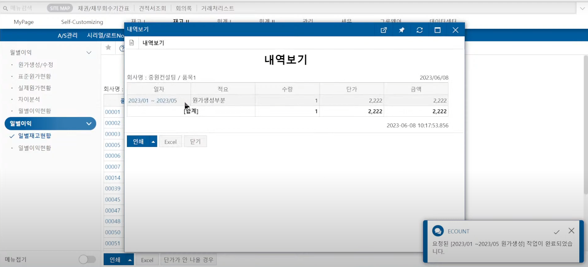 먼저 현재 기준 6월이지만, 원가가 생성된 기준년월은 2023년 5월까지로 세팅되어 있는 점을 참고해주시고,