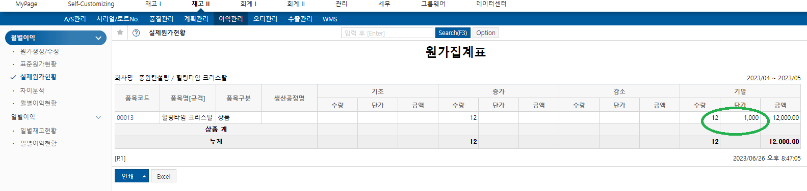 실제원가현황 조회 시 품목에 해당하는 상품들은 전체 기입하셔야 합니다.