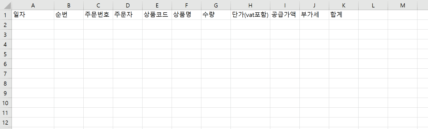 쇼핑몰에서 다운로드 받은 데이터가 위 이미지와 같다고 하겠습니다. 위와 같이 데이터를 기존에는 관리하였으나, 이를