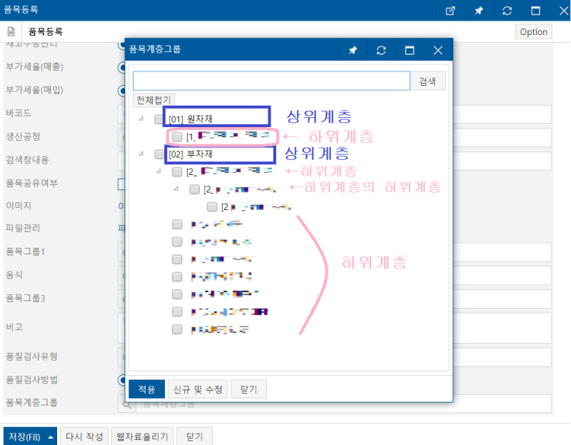 사진에서 체크 표시한 설정을 클릭하면 아래 사진과 같이 품목계층그룹에서 원하는 항목을 선택할 수 있습니다.