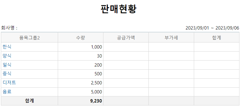 위에서 만든 품목그룹2에 대해서 판매전표를 임의로 입력하고 판매현황에서 확인해 본 모습입니다.